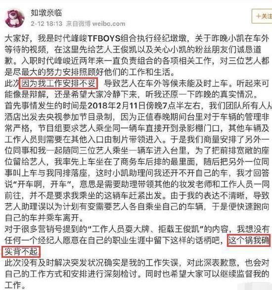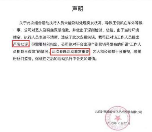 就如狗年春节联欢晚会彩排时,王俊凯和助理等着搭乘公司的车,但一直被车上的人员拒绝说还要等其他人,对王俊凯置之不理。